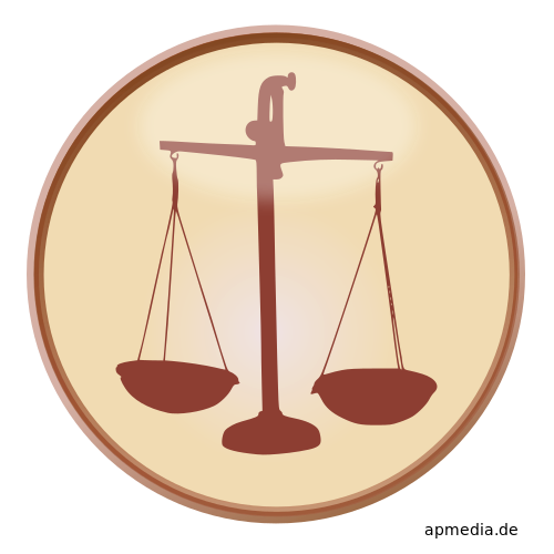 This features a round, brown and tan circle with an outline of the scales of justice. Inside this circle is a logo representing the scales of justice. Below the logo, there is the word "apmedia.de" written in white text. This design gives off a sense of balance and fairness, which are key aspects of the legal system. The use of brown and tan colors adds warmth to the overall appearance, making it an appealing visual representation of justice.