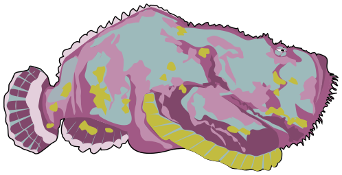 This features a colorful fish with an open mouth, lying on its side in the water. It appears to be a cartoon or illustration of a sea creature, possibly a stonefish. The fish is positioned towards the left side of the image and takes up most of the frame. Its vibrant colors make it stand out against the white background, creating an eye-catching scene.