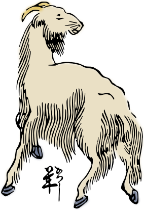 This features a goat standing on two legs, with its head turned to the side. It appears to be looking at something or someone off-camera. The goat is positioned in the center of the scene and takes up most of the frame. The drawing style gives it an old-fashioned appearance, reminiscent of a woodblock print from Japan.
