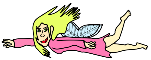 This features a cartoon drawing of a fairy girl, who appears to be flying through the air. She is wearing a pink dress and has blonde hair. Her arms are outstretched as she soars through the sky, giving an impression of freedom and playfulness. The scene captures her joyful spirit and adds a touch of whimsy to the image.