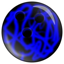 This features a blue and black bowling ball with a unique design. It has a blue background, and the surface of the ball is covered in swirls and patterns that create an interesting visual effect. There are three white dots on the ball, which add to its distinctive appearance. Overall, this bowling ball stands out due to its unconventional design and striking color combination.