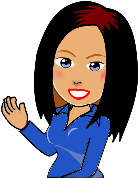 This features a cartoon-like woman with red hair, wearing a blue shirt and smiling. She has her hand up to her face, possibly waving or making a gesture. Her eyes are open wide, giving the impression of being surprised or excited. The woman's facial expression is cheerful and inviting, adding a sense of warmth to the scene.