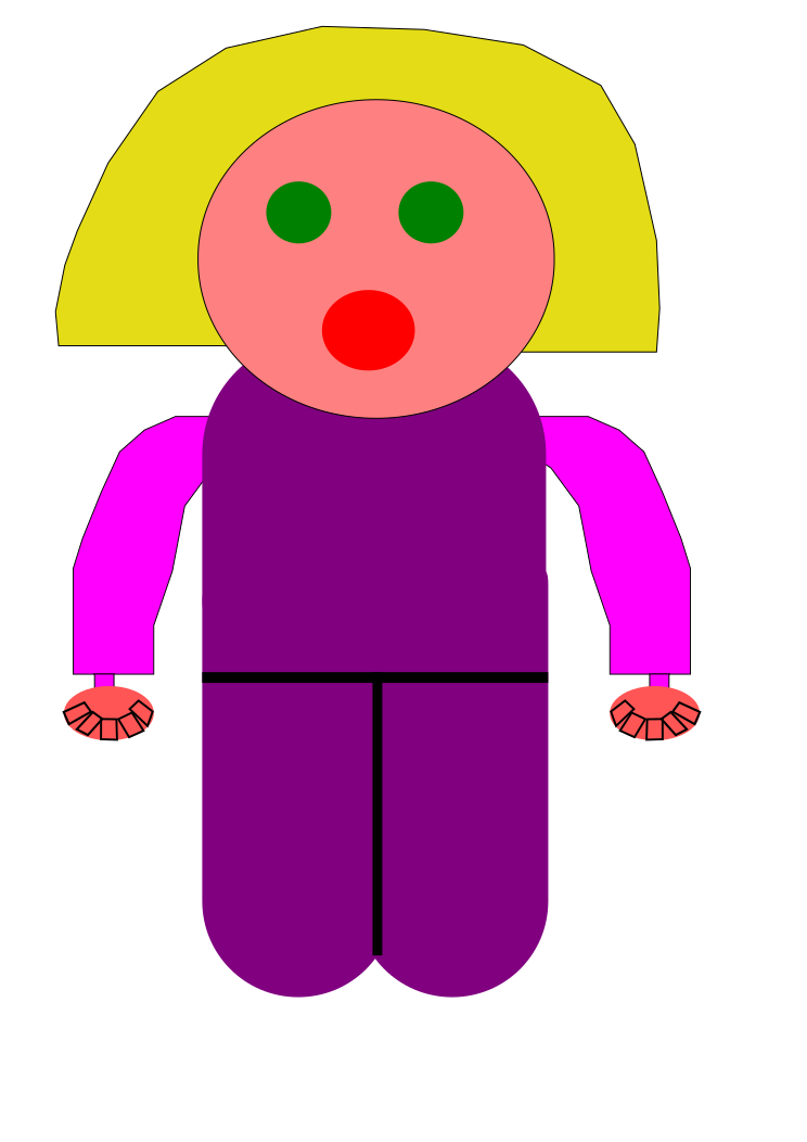 This features a cartoon girl made in Inkscape using various vector tools. She is wearing a purple shirt and has blonde hair, giving her a playful appearance. Her mouth is open, possibly expressing surprise or excitement. The girl's outfit consists of a pair of pants that are also purple in color. Overall, the image presents a fun and lively character with an engaging expression on her face.
