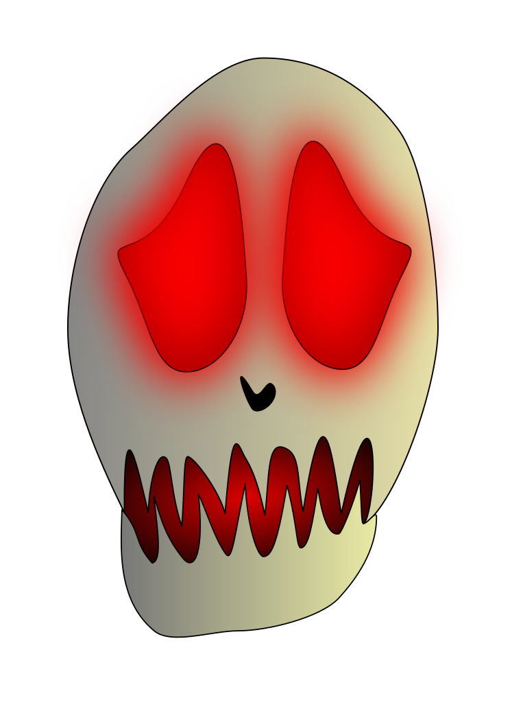 This features a creepy, red-eyed skull with a sad expression. It has two large, round eyes that are painted in shades of red and orange, giving the impression of being bloodshot or tearful. The skull's mouth is open, revealing its teeth, which further adds to its eerie appearance. This unique design makes it an interesting and unsettling piece of artwork.