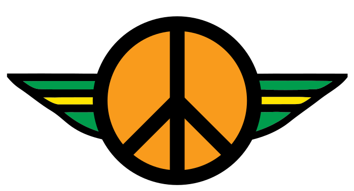 This features a peace sign, which is an orange circle with the word "peace" written in black. The peace sign is surrounded by green and yellow stripes, giving it a vibrant appearance. This symbol of peace is often used to represent harmony and unity among people or nations. The combination of colors and design elements creates a visually appealing logo that conveys the message of peace.