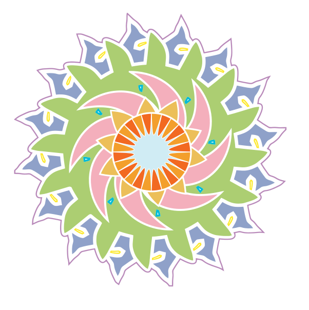 This features a colorful, abstract design with a central circle that is surrounded by various shapes and colors. This unique pattern resembles a flower or a sunburst, giving it an artistic and creative appearance. The circle in the center of the design has a yellow hue, while the surrounding shapes are filled with different shades of pink, green, blue, and orange. These vibrant colors create a visually appealing and lively atmosphere within the image.