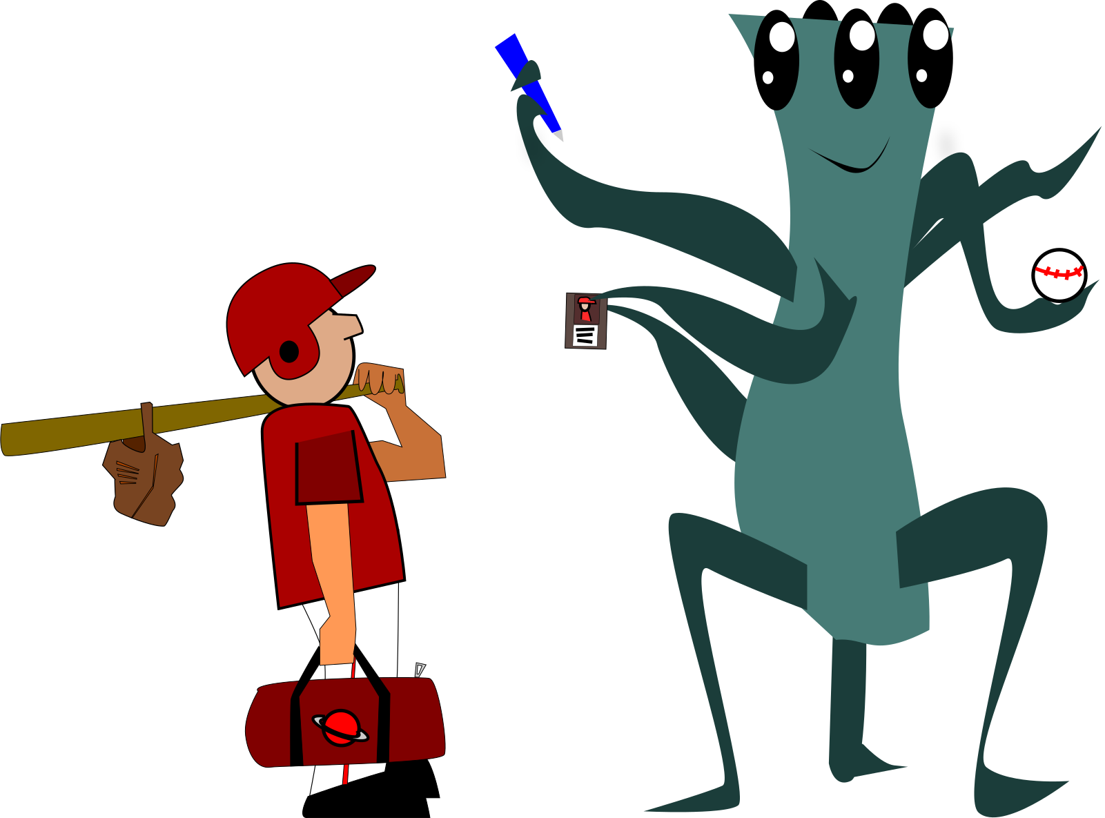 This features a baseball player standing next to an alien creature, who is holding up a baseball bat. They are both in the middle of a scene where the alien is signing autographs for the baseball player. The baseball player has his mouth open and appears to be enjoying the experience. In addition to the main characters, there are several other elements present in the image. A sports ball can be seen near the top right corner, while a cell phone is located towards the center of the scene. There's also a handbag placed on the ground close to the baseball player and an additional person standing further back in the scene.