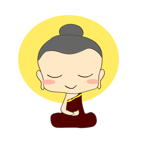 This features a smiling cartoon character with a yellow background, possibly depicting Buddha. The character is sitting in a lotus position on a brown cushion, which adds to the overall peaceful and serene atmosphere of the scene. The character's facial expression conveys happiness and contentment, making it an appealing and positive image.