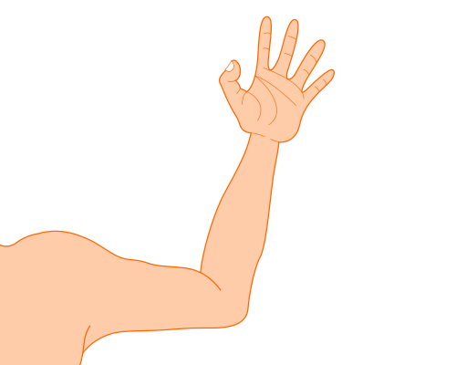 This features a person's arm with an orange hand raised in the air. The arm is positioned on top of a white background, which creates a contrast between the orange and white colors. The hand appears to be waving or gesturing towards something, possibly indicating a friendly gesture or a greeting. The overall composition of the image gives off a sense of movement and action, as if the person is actively engaging with their surroundings.