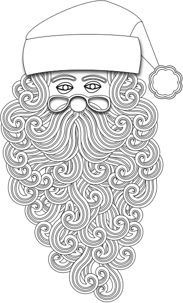 This features a colorful and detailed drawing of Santa Claus, complete with his signature beard, mustache, and hair. He is wearing a hat and has a large bow on his head, adding to the festive atmosphere. The drawing is in black and white, giving it an artistic and classic appearance. It appears to be a layered image, allowing for various elements of the design to be separated and manipulated as needed. This creative piece would make an excellent addition to a children's coloring book or any holiday-themed project.