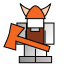 This features a cartoon-like character holding an orange and red hammer. This character appears to be wearing a helmet, giving it a warrior-like appearance. The character is standing in front of a shield, which adds to the overall theme of the scene. The color scheme of the character and its surroundings is predominantly orange and brown, creating a visually appealing contrast against the white background.