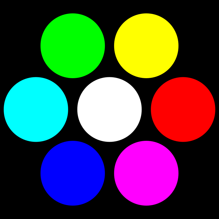 This features a close-up of seven colored circles, each with a different hue. These vibrant colors include blue, red, green, yellow, and pink. The circles are arranged in a circular pattern, creating an eye-catching display. The contrast between the bright colors and the black background makes this image particularly striking. This artistic arrangement of colored circles can be appreciated for its simplicity and visual appeal.