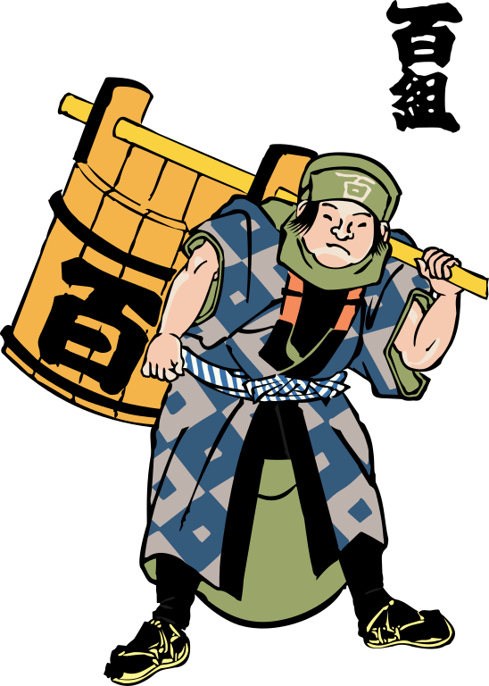 This features a man dressed in traditional Japanese clothing, carrying a large wooden barrel on his back. He is wearing a blue and white kimono, which adds to the cultural theme of the scene. The man appears to be strong and determined as he carries the heavy load with ease. The overall atmosphere suggests that this could be an illustration or artwork from the Edo period in Japan.