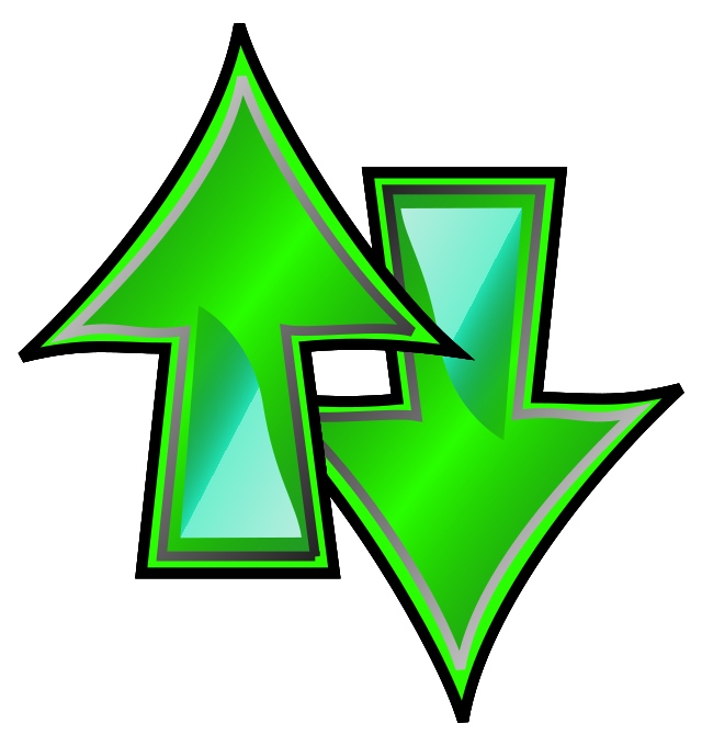 This features a green and blue arrow pointing upwards, with another identical arrow pointing downwards. These arrows are placed on top of each other, creating an interesting visual effect. The colors used for the arrows are predominantly green and blue, giving them a vibrant appearance. This design could be used in various contexts such as web pages or graphic designs to convey a sense of movement or direction.