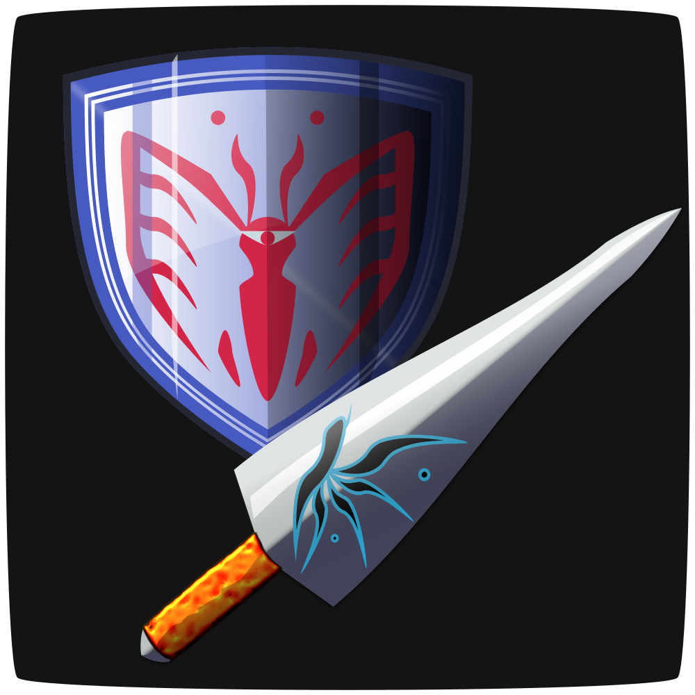 This features a shield with a blue background and a red and white design. On the shield, there is an illustration of a moth, which adds to its unique appearance. A sword can be seen next to the shield, creating a sense of adventure or battle. The combination of the shield and sword suggests that this could be part of a video game or fantasy setting where players engage in combat using these items as their weapons.