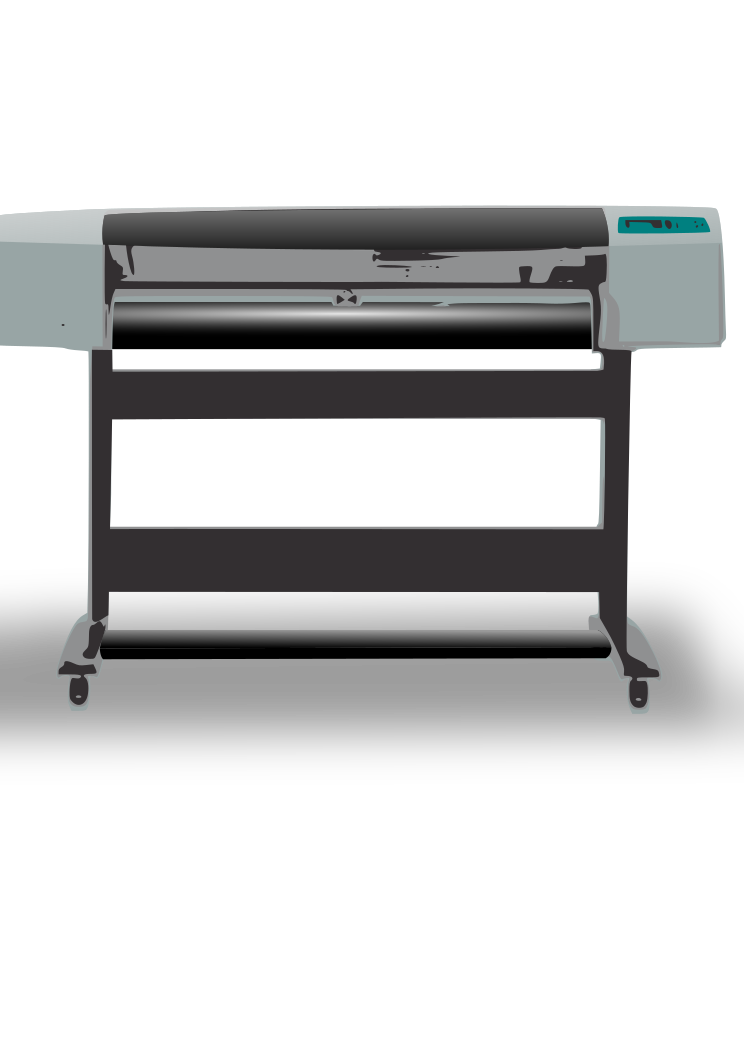 This features a large, black and gray printer sitting on top of a table. The printer is positioned in the center of the scene, taking up most of the space. The table appears to be a sturdy metal desk that provides ample support for the printer. The overall appearance of the scene suggests an office or workspace setting where this large printer serves as a central piece of equipment.