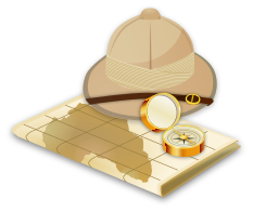 This features a map of Africa, which is placed on top of a book. A safari hat and compass are also present in the scene, adding to the adventurous theme. The safari hat is positioned above the map, while the compass is located near the bottom right corner of the image. This illustration creates an impression of a journey or exploration through Africa, with the tools provided for guidance and navigation.