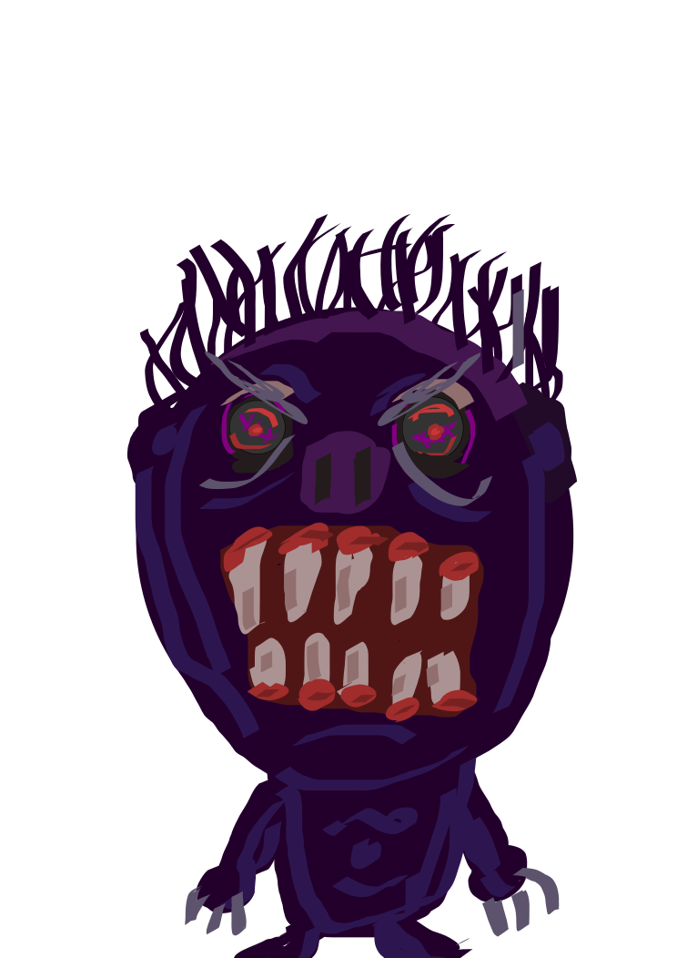 This features a purple monster with sharp teeth and claws, giving it an intimidating appearance. It has spiky hair that adds to its menacing look. The monster's mouth is open, revealing its teeth, which are prominently displayed in the foreground of the picture. This unique design creates a sense of danger and intrigue, making it an interesting piece of artwork or character concept.