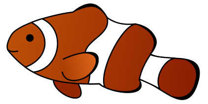 This features a cartoon fish, which is orange with white stripes and has fins. It appears to be a cute and playful representation of an animal, possibly inspired by the character Nemo from the movie Finding Nemo. The fish's body is positioned in such a way that it seems to be lying on its side or upside down, giving it a relaxed and fun appearance. This whimsical depiction of a fish could be used for various purposes, including as an illustration, decoration, or even as part of a children's book or educational material.