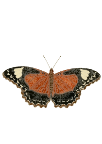 This features a close-up of a butterfly with its wings spread out. The butterfly has an orange and black color scheme, making it stand out against the white background. Its wings are open wide, showcasing their intricate patterns and details. The butterfly's wingspan is quite large, covering most of the image from left to right. This beautiful creature appears to be the main focus of the photograph, capturing its vibrant colors and unique features.