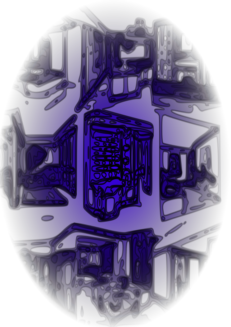 This features a purple and white picture of an interior space, possibly a room or a house. It is filled with various objects that are arranged in different positions throughout the scene. There are multiple chairs placed around the area, some closer to the foreground while others are further back. A dining table can be seen towards the right side of the image, and a refrigerator is located near the center. The overall composition creates an interesting visual effect with its vibrant colors and intricate arrangement of objects.