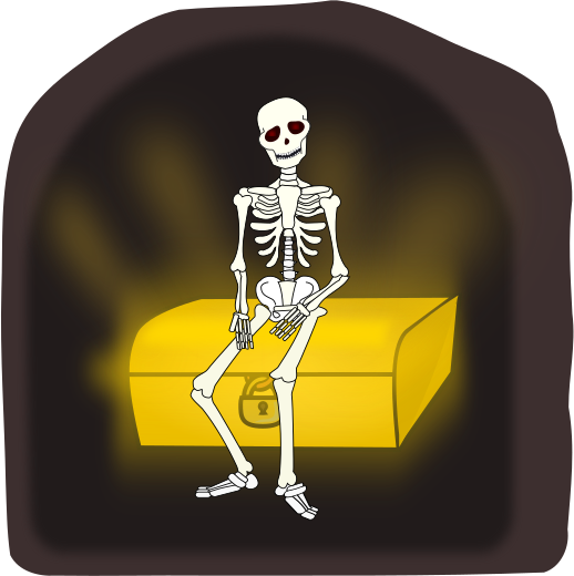This features a skeleton sitting on top of a yellow box, which appears to be a treasure chest. The skeleton is positioned in the center of the scene and seems to be enjoying its time with the chest. The background consists of a darker area, possibly representing a cave or an underground setting. This unique combination of elements creates a captivating visual that combines the themes of treasure hunting and skeletal imagery.