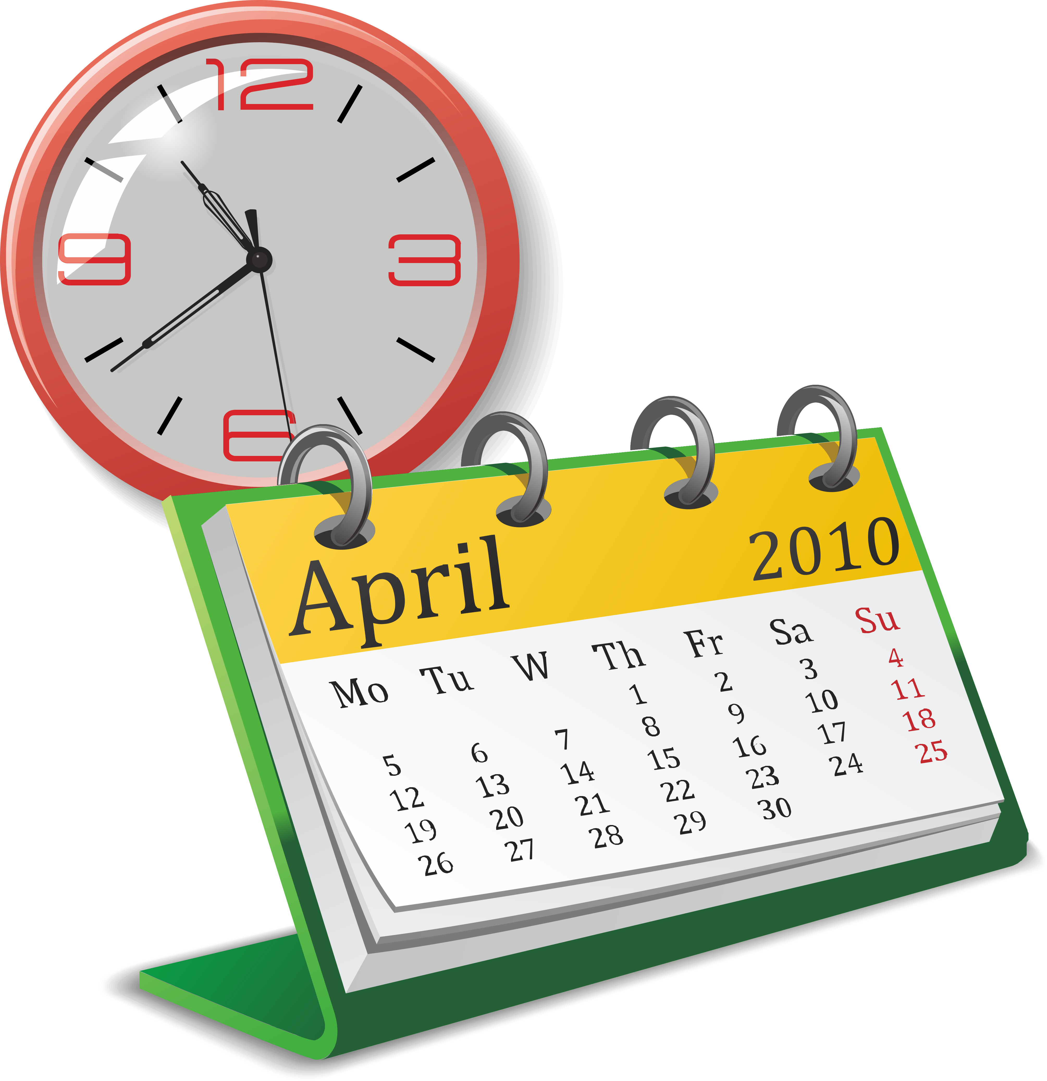 This features a green and white calendar with the month of April written on it. The calendar is open, revealing the dates for the entire month. Behind the calendar, there is a red and white wall clock that reads 10:39. This combination of elements creates an organized and functional workspace or home decoration.