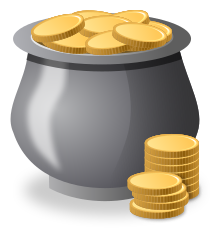 This features a large pot filled with gold coins, giving the impression of a treasure trove. There are numerous golden coins scattered throughout the pot, some resting on top and others inside the bowl. The coins vary in size and position, creating an eye-catching display that showcases the wealth within the pot. This illustration could be used to represent a Leprechaun's treasure or simply as a decorative piece for those who appreciate shiny gold coins.