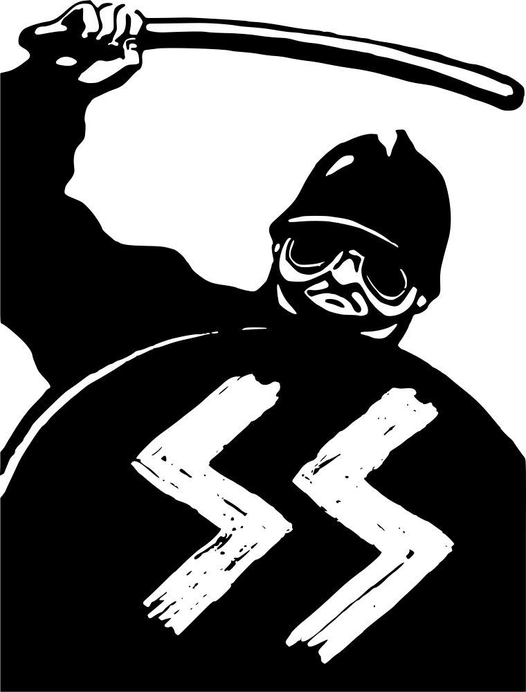 This features a black and white drawing of a man wearing a mask, holding a baseball bat. He appears to be dressed in a suit with the top half of his face covered by a mask. The man is standing on a shield, which adds an element of strength and protection to the scene. The overall composition of the image suggests that it could be related to a protest or demonstration, as the man's attire and the baseball bat he holds evoke a sense of defiance and determination.