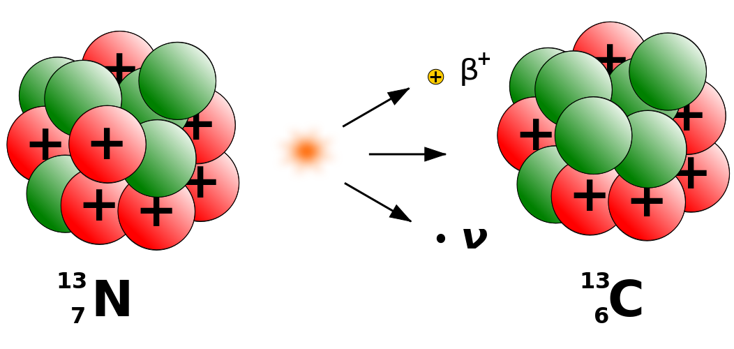 This displays a diagram of the beta plus decay process, where nitrogen 13 (N) is converted into carbon 13 (C). This process involves the emission of an electron and a positron. The diagram shows the progression of this transformation, with the initial state represented by N on one side and C on the other. Alongside these diagrams are various symbols representing the particles involved in the decay process, such as electrons, positrons, and neutrinos. These symbols are placed at different positions within the diagrams to illustrate their movement during the decay process. The image provides a clear visual representation of this complex nuclear reaction.