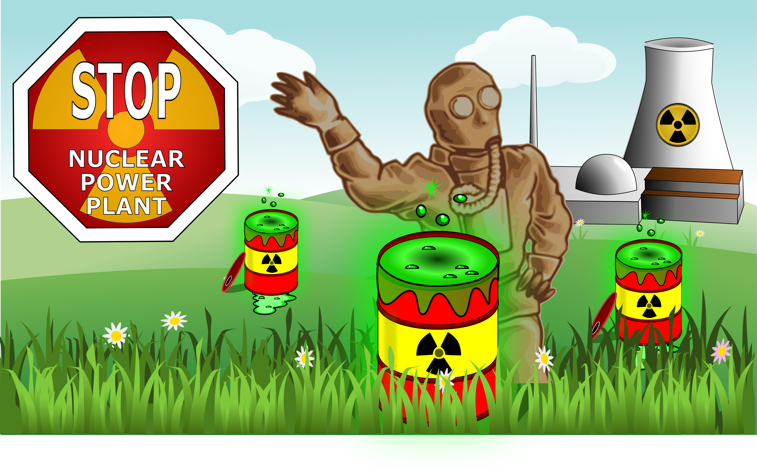 This features a cartoon character standing in the grass, holding a green and yellow barrel. This character is wearing a gas mask and appears to be warning people about nuclear power plants. There are several other barrels scattered around the scene, some of which are also glowing with neon colors. In addition to the main character, there are two more smaller figures in the background, one on the left side and another on the right side of the image. The overall atmosphere suggests a cautionary message about nuclear power plants and their potential dangers.