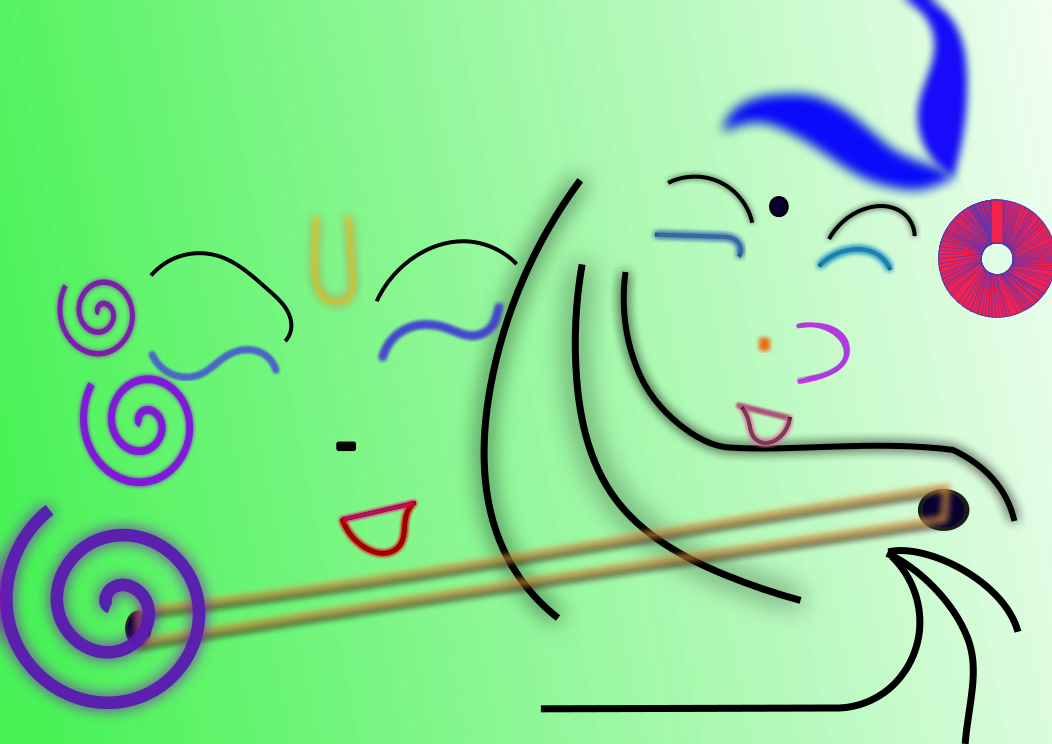 This features a colorful and creative illustration of two faces, one on the left side and another on the right. Both faces are smiling and have large eyes, giving them an animated appearance. In addition to the faces, there is a musical instrument depicted in the scene, with a pipe held by the face on the right. The image also includes a donut placed near the top-right corner of the illustration. Overall, it's a fun and playful artwork that combines elements of music and facial expressions.