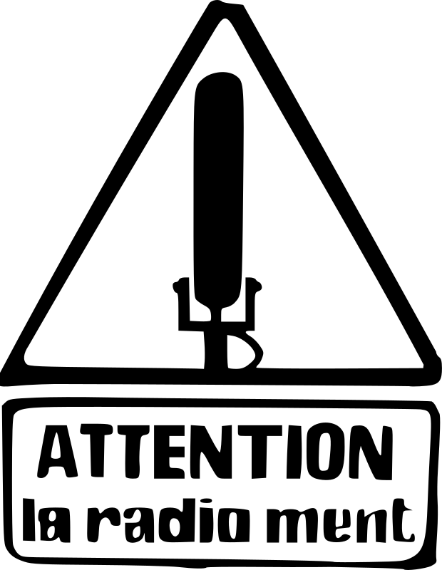 This features a sign with an exclamation point and the words "Attention La Radio Ment" written on it. This sign is likely meant to draw attention to something related to radio, possibly a warning or an announcement. The sign has a black background, which contrasts well with the white text, making it easy to read.