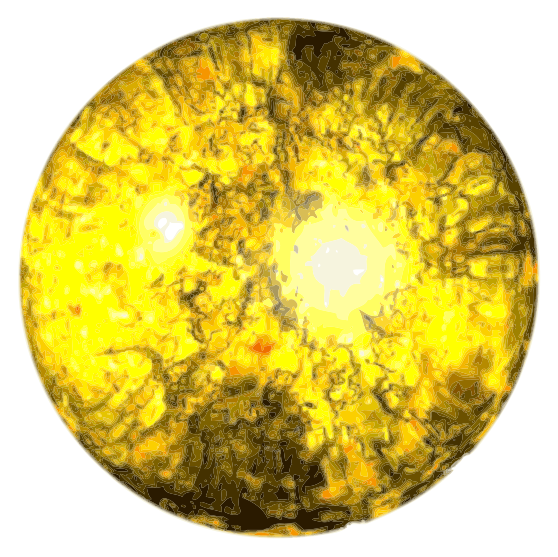 This features a round, yellow sun with golden flares inside of it. The sun appears to be in the middle of an orange and yellow hue, giving it a warm and inviting appearance. The bright colors create a sense of depth and contrast within the scene, making it visually appealing. This artistic representation of the sun could evoke feelings of tranquility or inspiration for those who view it.
