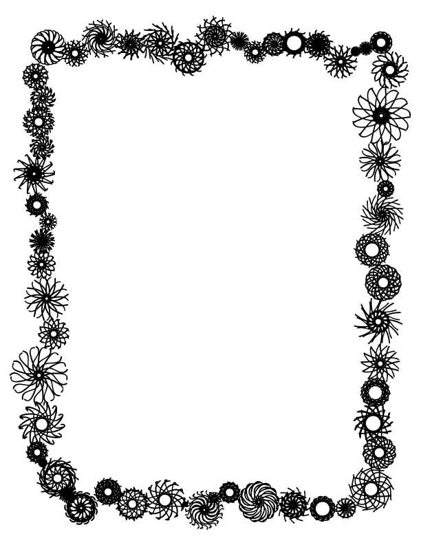 This features a black and white illustration of a rectangular frame, which is adorned with various shapes and sizes of flowers. These flowers are arranged in a circular pattern around the frame, creating an intricate and visually appealing design. The overall effect is that of a decorative border or embellishment, adding a touch of elegance to any setting where it might be displayed.