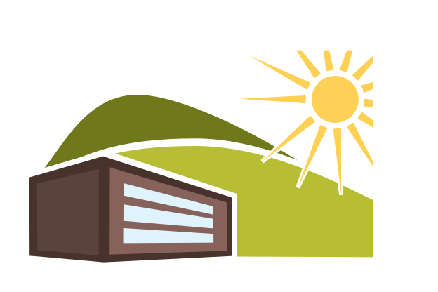 This features a large building with many windows, situated in front of a beautiful landscape. The building is surrounded by lush greenery and has a sunny atmosphere. Above the building, there is a bright yellow sun shining down on it, creating an inviting scene. The combination of the building's architecture and the natural surroundings creates a serene and picturesque setting.