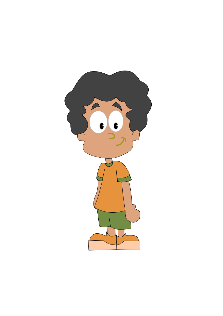 This features a cartoon character, possibly a young boy or a man with a mustache and goatee. He is wearing an orange shirt and green shorts, giving him a casual and friendly appearance. The character appears to be standing in front of a white background, which adds emphasis to his figure. His facial expression suggests that he might be smiling or making a funny face, adding a playful element to the image.