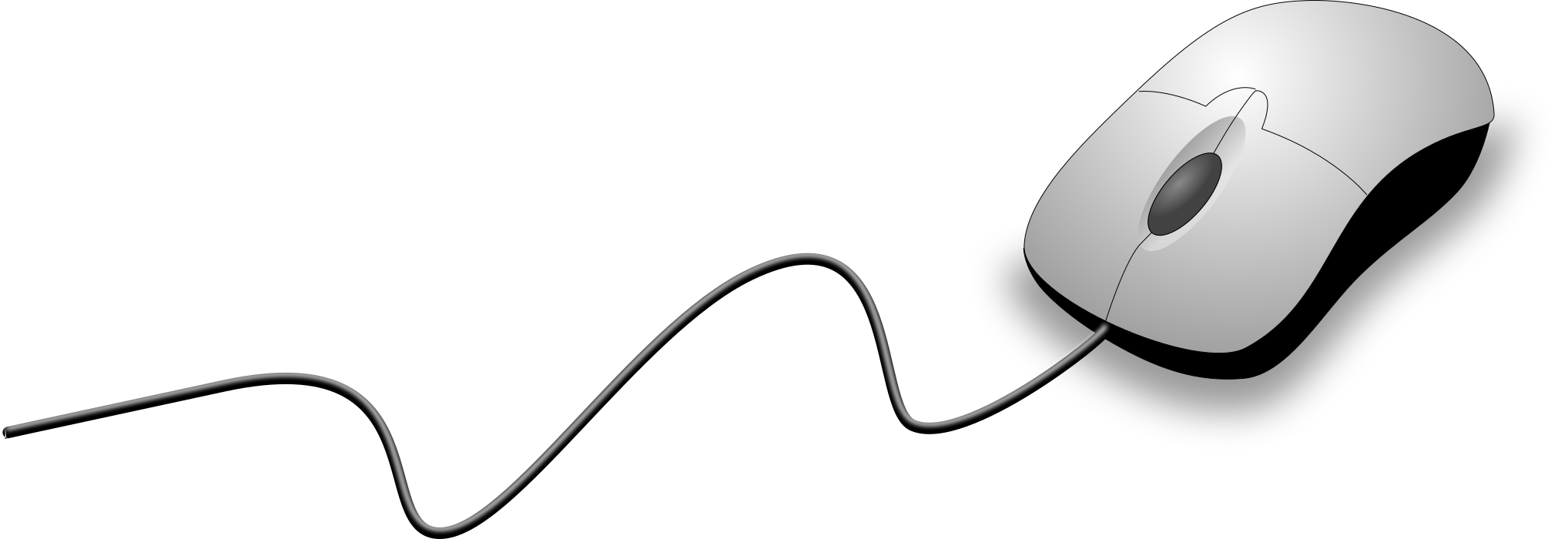 This features a computer mouse with its cord stretched out, seemingly floating in the air. It is positioned towards the top of the scene and appears to be the main focus of the image. The mouse's cord extends from it, creating an interesting visual effect. The overall composition of the image gives off a sense of motion or action, as if the computer mouse were in use or being moved around.