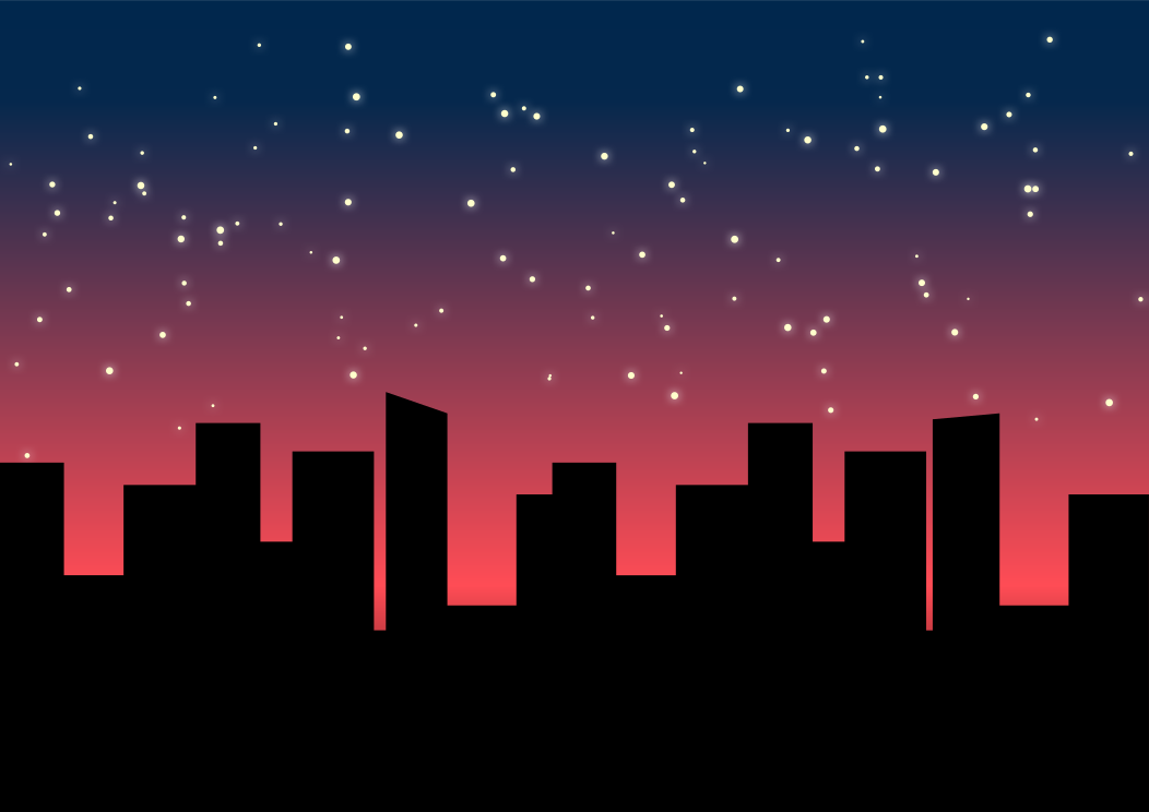 This depicts a nighttime city skyline with tall buildings and a dark, cloudy sky. The city's silhouette is prominently displayed against the backdrop of the night sky, which is filled with numerous stars. The scene captures the beauty of the urban landscape at night, as the lights from the buildings contrast with the darkness of the sky. The image evokes a sense of tranquility and serenity, as the city's hustle and bustle are momentarily paused in favor of the peacefulness of the nighttime setting.