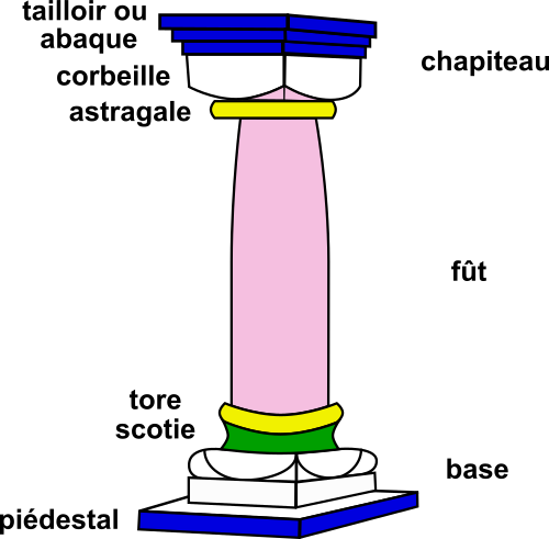This is a drawing of a pillar, which has been labeled with various French words. These labels include terms such as "tore," "scotie," and "base." There are also other labels that describe the different parts of the pillar, including its base, top, and sides. This drawing provides an interesting perspective on the structure and components of a pillar.