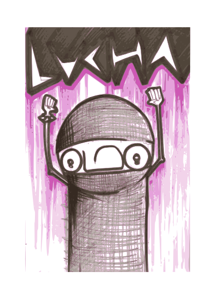 This features a cartoon-like character with its arms raised in the air, giving off an impression of protest or defiance. The character is wearing a black outfit and has a pink background behind it. This drawing appears to be a creative representation of a person standing up for their beliefs or making a statement.