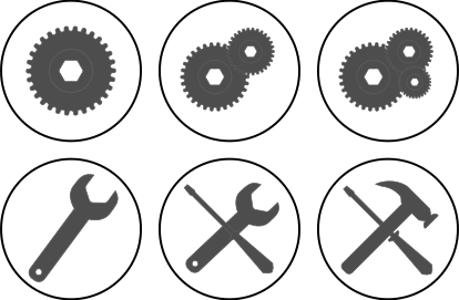 This features a collection of six circular icons, each containing different tools. In the top three icons, there are gears displayed, while in the bottom three, wrenches, screwdrivers, and hammers can be seen. These icons are arranged neatly within a square formation, showcasing their various functions. The arrangement of these icons suggests that they might represent different tools used for repairing or maintaining objects, with each tool having its own unique purpose.