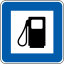 This features a blue and white sign with an icon of a gas pump. This sign is likely used to indicate the location of a fuel station or service station. The sign has a black outline, which contrasts well against the blue background. The design of the sign is simple yet effective in conveying its purpose.