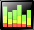 This features a graph with multiple bars on it. Each bar is colored yellow and green, creating an eye-catching visual effect. The bars are arranged in a way that makes the graph appear to be a representation of sound waves or music notes. This unique design could potentially be used as a button or icon for various applications, such as music players or audio editing software.