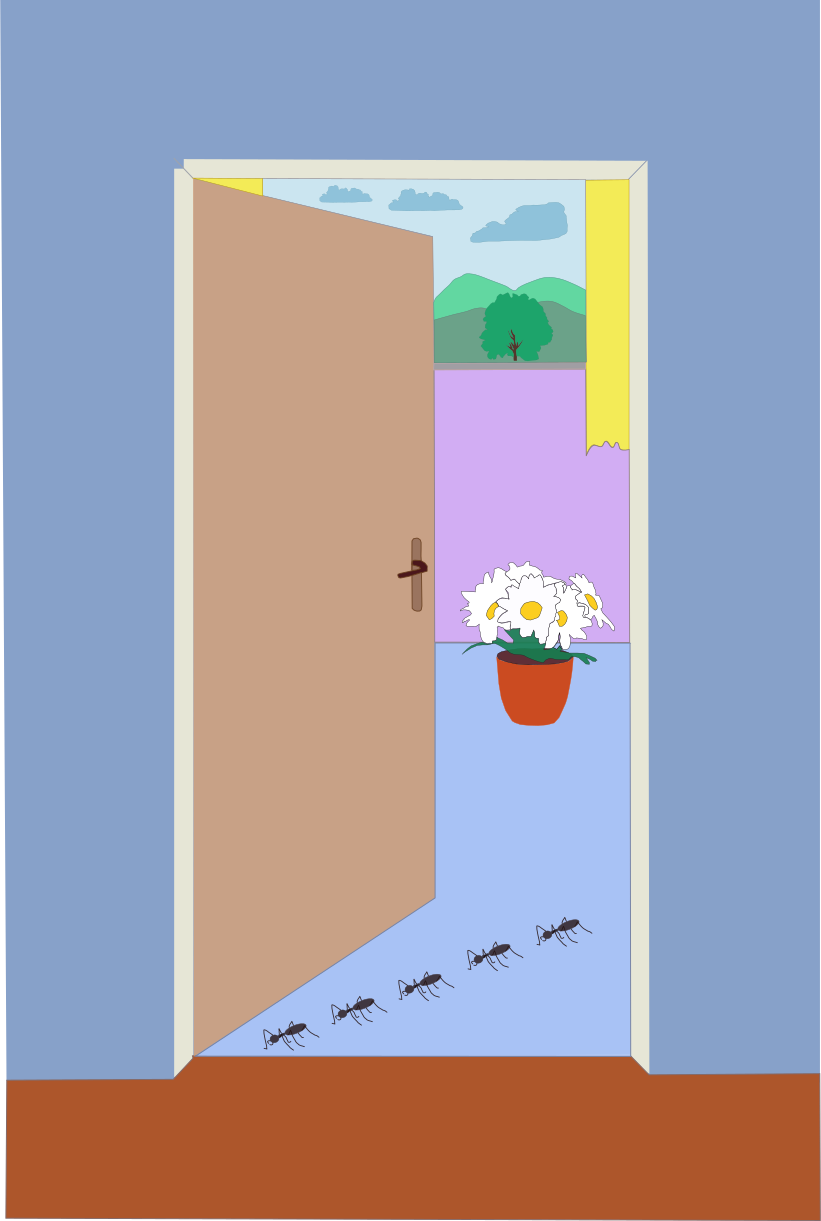This features a doorway with an open door, leading to a brightly colored room. Inside the room, there is a potted plant placed on a table, adding a touch of greenery to space. A vase filled with flowers sits next to the plant, further enhancing the room's decoration. The combination of the doorway and the colorful interior creates an inviting atmosphere in the image.