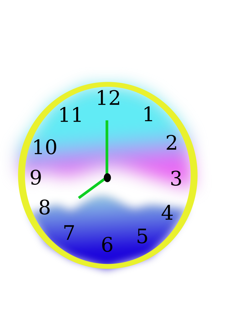 This features a clock with a unique design, showcasing the time in a colorful and artistic manner. The clock's face is adorned with a blue background that contrasts beautifully with the yellow numbers and hands. The clock also displays a sunset scene on its surface, adding to the overall visual appeal of the piece. This creative design makes it an interesting and eye-catching timepiece for anyone who appreciates artistic interpretations of everyday objects.