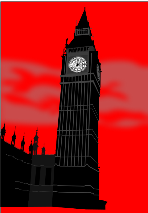This features a silhouette of the Big Ben clock tower in London, England. The iconic landmark is prominently displayed against a red background, which adds to its striking appearance. The clock face on the tower is visible and stands out as an important detail within the scene. This artistic representation of the famous clock tower captures its essence and beauty while emphasizing its unique architectural features.