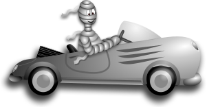 This features a cartoon character, possibly a mummy or a skeleton, sitting in the driver's seat of a classic white sports car. The car is positioned on the left side of the scene and appears to be moving forward. The cartoon character seems to be enjoying their ride as they sit behind the wheel, giving the impression that they are driving the vehicle. This whimsical image showcases the creativity and playfulness often found in comic artwork or animated characters.