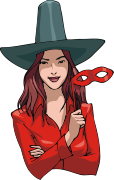 This features a woman wearing a red shirt and a witch's hat. She is holding a red eye mask in her hand, giving the impression that she might be dressed up for Halloween or another costume party. Her outfit appears to be inspired by the character of Dorothy from "The Wizard of Oz," as she is wearing a red shirt and a hat reminiscent of the one worn by the iconic character. The woman's pose suggests that she might be striking a playful or dramatic stance, adding to the overall fun and whimsy of her costume.