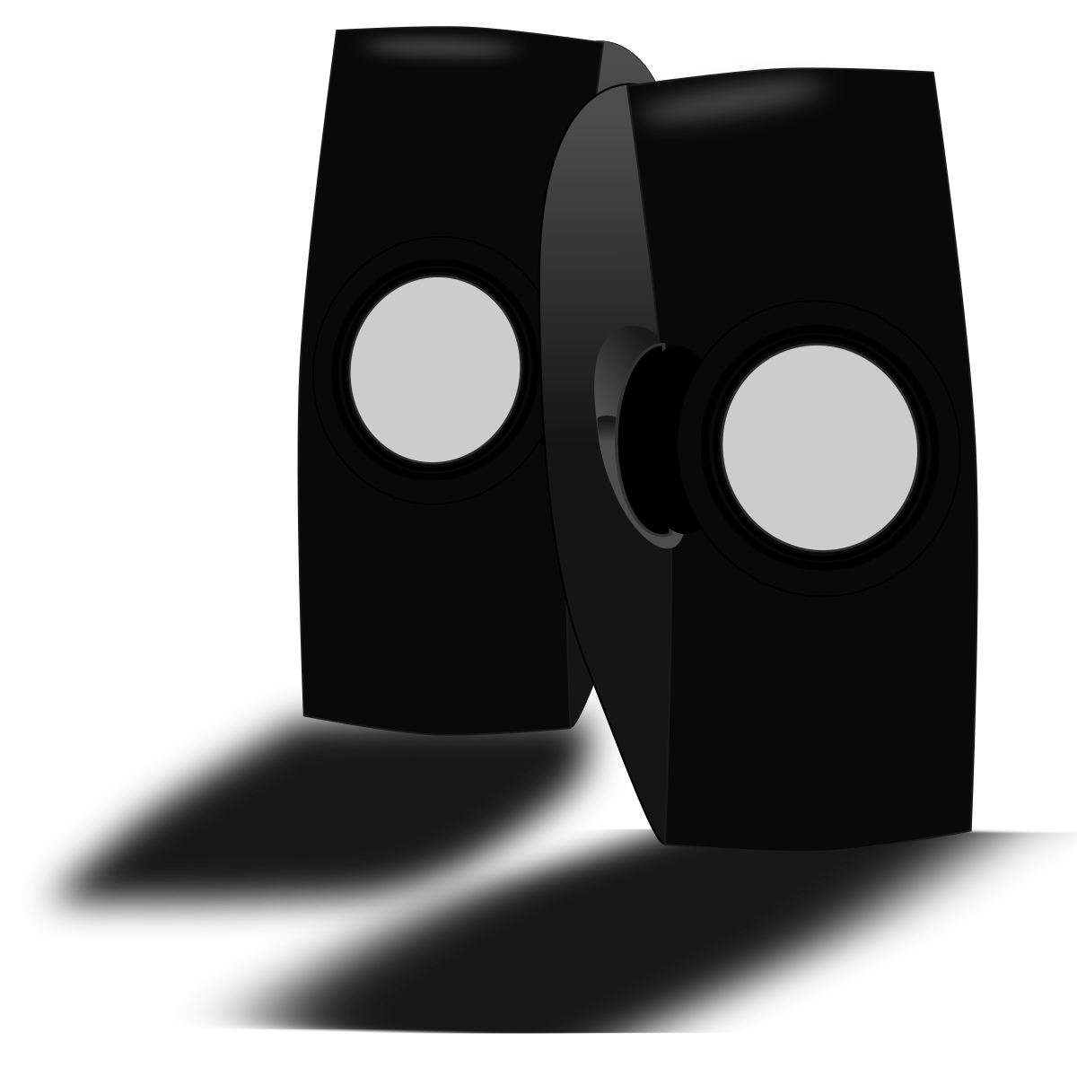 This features a pair of black speakers, each with two round circles on the front. These speakers are placed side by side and appear to be in shadow, giving them an almost three-dimensional appearance. They seem to be positioned against a white background, which further emphasizes their shape and design. The speakers' unique design and contrasting colors make them stand out as an interesting focal point in the image.
